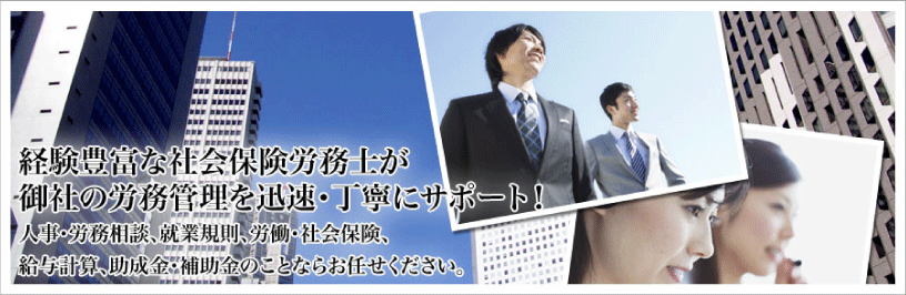 当事務所では、50種類以上にのぼる労働・社会保険の法令に基づいて、行政機関に提出する書類や申請書等を事業主様に代わって作成および提出代行を代理することをはじめ、解雇や問題社員の対応などの労働相談、給与計算の代行、就業規則・人事制度・賃金制度・退職金制度等の各種社内規定の作成、助成金の手続代行、労働紛争解決機関等におけるあっせんの代理などの業務を行っています。